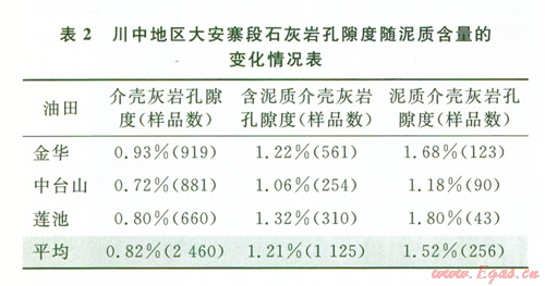 根據(jù)目前已取心鉆井的物性測試,表明大安寨段主要產(chǎn)層段的石灰?guī)r孔隙度極低,大多小于1%,顯示出非儲集層的特征,油氣產(chǎn)出主要是純石灰?guī)r的裂縫起作用。而有測試顯示,泥質(zhì)含量越高孔隙度反而越高,石灰?guī)r越純則孔隙度反而越低,純介殼灰?guī)r孔隙度平均小于l%(表2)。