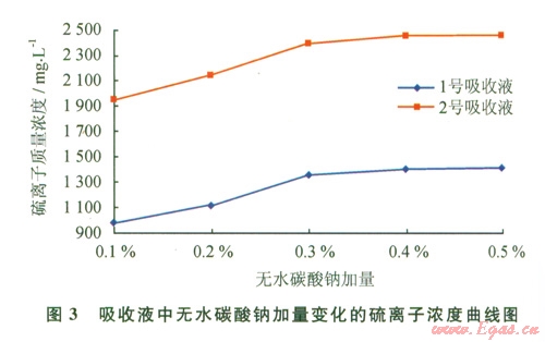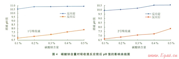實(shí)驗(yàn)考查無水碳酸鈉加量對(duì)吸收液吸收效果的影響,制作了兩套吸收液l號(hào)(水+4%膨潤土+不同濃度無水碳酸鈉)、2號(hào)(水+4%膨潤土+0.2%除硫劑+不同濃度無水碳酸鈉)進(jìn)行實(shí)驗(yàn),結(jié)果見圖3、4。