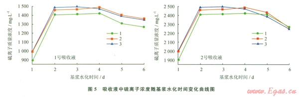 圖5中吸收液中硫離子濃度在基漿水化2 d后基本達(dá)到最大值,原因是此時(shí)膨潤土造漿效果最好,膨潤土比表面積較大;2~4 d內(nèi)吸收液中硫離子濃度無明顯變化;5~6 d吸收液中硫離子濃度開始降低。分析原因是基漿放置5 d后,底部有明顯的膨潤土固體分層現(xiàn)象,膠體穩(wěn)定性變差所致[7]。因此確定基漿最佳水化時(shí)間為2 d。