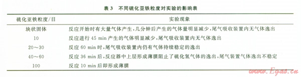 硫化氫氣體發(fā)生裝置中采用硫化亞鐵與稀硫酸按一定比例進(jìn)行反應(yīng)生成硫化氫氣體。實(shí)驗(yàn)過程中硫化氫氣體產(chǎn)生的速度不夠穩(wěn)定,這主要與反應(yīng)物硫化亞鐵的粒度以及反應(yīng)溫度有關(guān)。實(shí)驗(yàn)采用