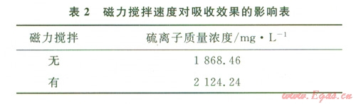 在吸收裝置中加有磁力攪拌來模擬井底流體的擾動(dòng),以期獲得吸收劑盡可能達(dá)到最大吸收效果。由于儀器條件的限制,實(shí)驗(yàn)確定磁力攪拌器的轉(zhuǎn)速以磁轉(zhuǎn)子不產(chǎn)生跳動(dòng)的最大穩(wěn)定轉(zhuǎn)速進(jìn)行實(shí)驗(yàn),結(jié)果見表2。由表2可以看出吸收裝置中是否加有磁力攪拌,對(duì)吸收劑吸收效果影響較大,說明流體流動(dòng)形態(tài)對(duì)氣液兩相傳質(zhì)有很大影響。