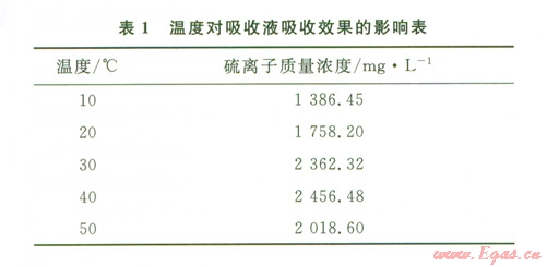經(jīng)過多次實(shí)驗(yàn)發(fā)現(xiàn)不同室溫條件下所測數(shù)據(jù)有較大差異,在其他實(shí)驗(yàn)條件相同的情況下,隨溫度升高,吸收液中硫離子濃度顯著升高。因此在吸收液吸收裝置下加恒溫磁力攪拌器以此調(diào)節(jié)反應(yīng)溫度,并評(píng)價(jià)吸收液吸收效果,結(jié)果見表1。