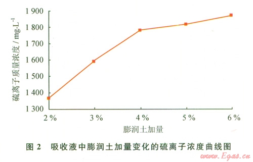 如圖2所示膨潤土加量對(duì)吸收液吸收效果有明顯的影響,但在膨潤土加量為4%以后,吸收液中硫離子濃度隨膨潤土加量的增加變化不大。分析產(chǎn)生這種現(xiàn)象的主要原因是膨潤土本身對(duì)硫化氫有一定的物理和化學(xué)吸附作用,物理吸附主要是硫化氫分子在膨潤土表面的吸附,化學(xué)吸附主要是發(fā)生在膨潤土膠體表面的陽離子交換吸附。