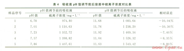 實(shí)驗(yàn)發(fā)現(xiàn),吸收液在吸收硫化氫反應(yīng)后溶液的pH值都低于l0。結(jié)合圖7中所示水溶液中硫化氫存在形態(tài)與溶液pH值的關(guān)系可知:在此pH值范圍內(nèi),吸收液中硫化氫主要以H2S和HS-的形態(tài)存在。分析在這種條件下用碘量法測得的硫離子含量不能真實(shí)地反映出吸收液中硫離子的含量。因此要在滴定前調(diào)節(jié)吸收液的pH值大于11,在此pH值范圍內(nèi)溶液中硫化氫主要以S2-的形式存在。這樣可以接近真實(shí)的反應(yīng)吸收液中硫化氫的含量。取圖4中1號(hào)吸收液吸收硫化氫反應(yīng)后的溶液,對(duì)比分析pH值調(diào)節(jié)前后的數(shù)據(jù),結(jié)果見表4。