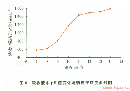 如圖6所示,隨吸收液pH值的增加,反應(yīng)后吸收液中硫離子濃度逐漸增加,當(dāng)吸收液中pH值達(dá)ll后吸收液有明顯的吸收效果,這符合鉆井現(xiàn)場在鉆遇含硫化氫地層時(shí)調(diào)節(jié)鉆井液pH值大于11的工藝要求。