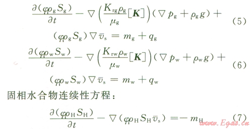 假定地層孔隙中含水、氣體和水合物三相,只有水和氣體兩相可以流動(dòng)?;谶B續(xù)性方程及廣義達(dá)西定律等,得到滲流方程: