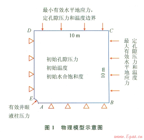 溫度場(chǎng)邊界條件:BC、CD兩邊為固定原始地層溫度邊界,AB、DE兩邊為自由邊界,AE井眼處為鉆井液溫度邊界。