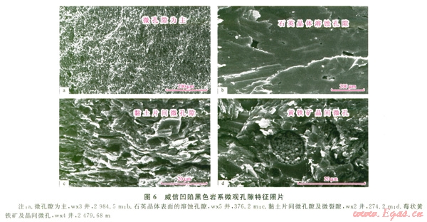 一直以來針對(duì)泥頁巖儲(chǔ)層的研究較少,本次重點(diǎn)研究了黑色巖系中泥頁巖的微觀孔隙特征。前人研究的成果證實(shí),頁巖中實(shí)際上含有大量的孔隙和裂縫,可作為天然氣儲(chǔ)層。根據(jù)孔隙尺寸,可將泥頁巖中的孔隙分為2種類型:微孔隙(d>0.75 μm)和納米級(jí)孔隙(d<0.75μm)[8]。通過掃描電鏡研究發(fā)現(xiàn),黑色巖系中泥頁巖中納米孔隙、微孔隙和微裂縫十分發(fā)育,孔隙直徑介于l00 nm~50 μm(圖6),黑色巖系中的黑色頁巖在掃描電鏡下可見多種類型微孔隙:方解石、白云石和石英粒間微孔隙;黏土礦物晶間孔隙;斜長石溶蝕孔和云母片狀孔隙,呈孤立狀,或者由狹長平直的吼道連接(圖6)。