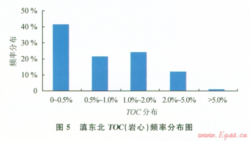 巖心樣品分析揭示,黑色巖系TOC值變化范圍廣,而且下部總體較上部高。本次研究共測試了9口井的506塊樣品的總有機(jī)碳含量。TOC (巖心)介于0.02%~9.37%之間,平均為0.97%,TOC頻率劃分為5個(gè)區(qū)間(圖5),其中,0<TOC<0.5%頻率最高(占41.26%),0.5%<TOC<1%占21.52%,l%<TOC<2%占24.22%,2%<TOC<5%占l2.11%,TOC>5%占0.9%。需要說明的是,烴源巖中有機(jī)碳以3種形式存在:①烴類中殘余有機(jī)碳;②轉(zhuǎn)化為烴類(可轉(zhuǎn)換碳、活性碳和不穩(wěn)定碳)(Cooles等,l986);③碳質(zhì)殘?jiān)?,不具生烴能力,缺少轉(zhuǎn)化為烴類所需足夠的氫,通常稱為惰性碳、死碳。由于有機(jī)碳的轉(zhuǎn)化作用,所以原始有機(jī)質(zhì)含量比現(xiàn)今殘余有機(jī)碳含量高(TOC),有20%[7]~36%的差值。