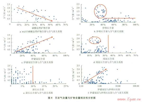 從研究結(jié)果中發(fā)現(xiàn)(圖8):在寬緩向斜和斷層發(fā)育少的構(gòu)造區(qū)域,頁巖礦物中斜長石、碳酸鹽巖和黏土礦物(伊利石、綠泥石和伊蒙混層)等含量的大小,影響了頁巖氣含量的高低:伊利石含量介于25%~40%區(qū)間時(shí),頁巖含氣量相對(duì)較高,普遍大于