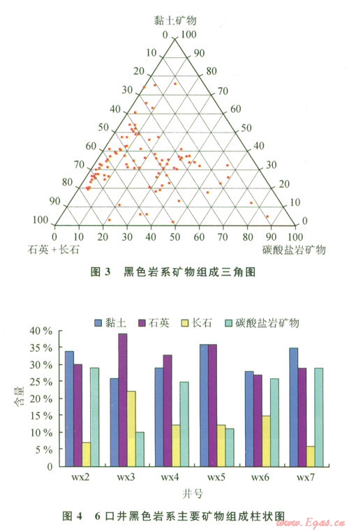 頁巖的礦物組成、有機(jī)碳含量和有機(jī)質(zhì)成熟度是頁巖儲(chǔ)層發(fā)育的3個(gè)最重要因素。滇東北黑色巖系頁巖礦物成分統(tǒng)計(jì)表明(圖3、4),6口井(wx2、wx3、wx4、wx5、wx6、wx7)黑色巖系黏土礦物含量平均值分別為34%(4%~55%)、26%(5%~40%)、29%(2%~65%)、36%(12%~53%)、28%(20%~36%)、35%(3%~82%);石英含量平均值分別為30%(2%~39%)、39%(9%~50%)、33%(24%~51%)、36%(11%~52%)、27%(14%~34%)、29%(10%~65%);長石平均含量分別為7%(2%~l5%)、22%(2%~32%)、12%(3%~27%)、12%(1%~26%)、15%(1%~22%)、6%(1%~l5%);碳酸鹽巖類(方解石和白云石)平均含量分別為:29%(8%~94%)、l0% (2%~86%)、25%(3%~48%)、11%(2%~74%)、26%(5%~55%)、29%(1%~58%)。頁巖中的石英呈紋層狀或分散狀分布,顆粒大小介于0.03~0