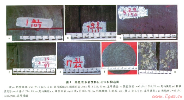 以纖維鱗片狀伊-蒙混雜黏土礦物為主,粉泥晶方解石分布均勻(圖2i),因富含有機(jī)質(zhì)而呈灰色、灰黑色,一般形成于乏氧的富硫化氫的閉塞海灣、潟湖和湖泊的深水區(qū)以及欠補(bǔ)償盆地與深海溝內(nèi)。在龍馬溪組和牛蹄塘組中下部廣泛發(fā)育,黑色頁巖是頁巖氣勘探的主體。