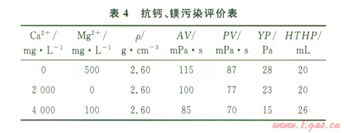 對(duì)可應(yīng)用于鹽膏層鉆井液來(lái)說(shuō),較強(qiáng)的抗鈣、鎂離子污染性能是其必須具備的基本性能。進(jìn)行了抗鈣、鎂污染評(píng)價(jià),試驗(yàn)結(jié)果見(jiàn)表4。