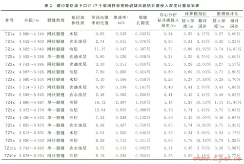 表4是在考慮儲(chǔ)層流體性質(zhì)時(shí)兩種計(jì)算模型在不同裂縫系統(tǒng)中的計(jì)算對(duì)比分析表。同一類(lèi)型裂縫型地層,從水層→含油水層→含水油層→油層,不管是體積模型還是統(tǒng)計(jì)模型,其計(jì)算結(jié)果均表現(xiàn)出侵入深度是增加的,呈現(xiàn)污染或者損害增加的趨勢(shì)。在結(jié)合所選擇分析井段使用的鉆井液看,都使用的是水基(鹽水)鉆井液,不難分析出,該區(qū)9口井17個(gè)裂縫性致密砂巖儲(chǔ)層段巖石均為親水巖石,若選擇油基鉆井液,鉆井液的侵入深度會(huì)大幅度降低,儲(chǔ)層受污染或損害的幾率也會(huì)降低。