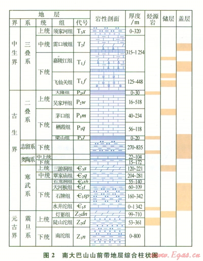 該區(qū)主要經(jīng)歷了2個(gè)大的沉積—構(gòu)造演化階段:震旦紀(jì)—中三疊世為海相臺(tái)地—臺(tái)緣沉積—構(gòu)造演化階段;晚三疊世—始新世為陸相碎屑沉積盆地沉積—構(gòu)造演化階段。總體上缺失上志留統(tǒng)一石炭系,其他層位較為齊全。發(fā)育4套構(gòu)造—地層沉積組合:①基底組合(Pt);②臺(tái)地(臺(tái)緣)組合(Z—S);③臺(tái)地—裂陷邊緣組合(P—T2);④前陸盆地組合(T3x—J)。
