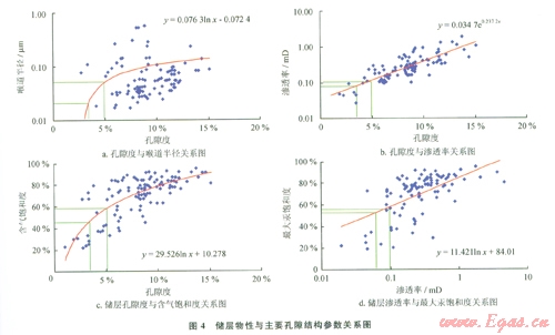 由圖4可得,當(dāng)飽和度一定時,孔隙度隨最小流動孔喉半徑的增大而增大;當(dāng)最小流動孔喉半徑一定時,孔隙度隨含氣飽和度的增大而增大。盒8、山l段最小流動孔喉半徑為0.05µm,山2段最小流動孔喉半徑為0.02µm,根據(jù)物性和孔喉結(jié)構(gòu)相關(guān)關(guān)系圖(圖4),用最小流動孔喉半徑來確定儲層孔隙度,進(jìn)而確定滲透率、含氣飽和度下限值:盒8、山l段孔隙度下限取值為5.0%,滲透率下限取值為0.10 mD,含氣飽和度下限為55.0%;山2段孔隙度下限為3.5%,滲透率下限為0.075 mD,含氣飽和度下限為45.0%。