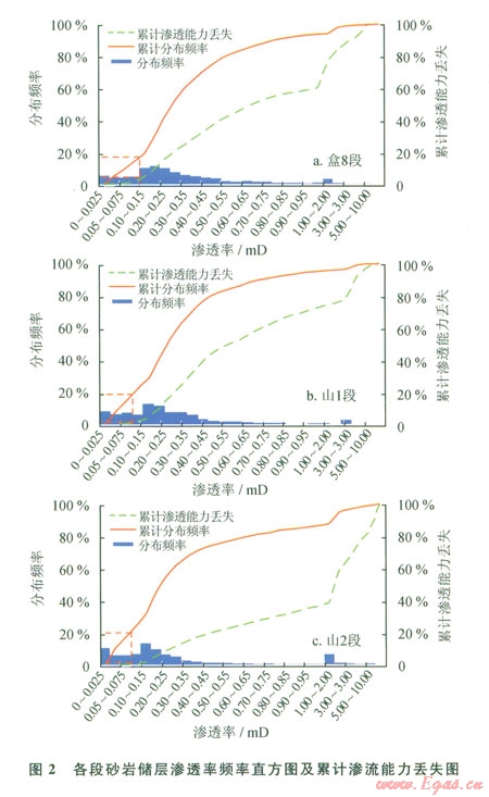 經(jīng)對蘇東地區(qū)盒8段、山1段、山2段的物性特征、巖性特征和孔隙結(jié)構(gòu)特征分析,認(rèn)為該區(qū)儲層為典型的中低孔-低孔、低滲-特低滲儲層??紫抖葹?span lang="EN-US">5%~l5%,滲透率為0.1~1.0 mD,滲透率能力較差。按照經(jīng)驗統(tǒng)計法(圖1、2),考慮到長慶油田低孔、低滲的儲層特點,按照累計頻率丟失不超過總累計的20%,累計儲能、產(chǎn)能丟失不超過總累計的l0%。當(dāng)