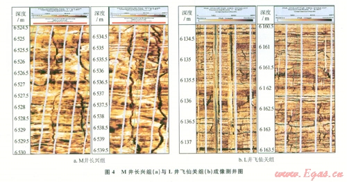 飛仙關(guān)組輸導(dǎo)體主要由鮞?;?guī)r儲(chǔ)集體和裂縫構(gòu)成(圖2-b)。根據(jù)儲(chǔ)層段巖心物性的統(tǒng)計(jì)分析(圖3-b),絕大多數(shù)樣品點(diǎn)的孔滲相關(guān)性較好,只有極個(gè)別樣品點(diǎn)滲透率異常,說明飛仙關(guān)組的裂縫不發(fā)育,主要為孔隙型儲(chǔ)集空間。結(jié)合成像測井分析(圖4-b),與長興組相比,飛仙關(guān)組動(dòng)態(tài)圖像表現(xiàn)為大套塊狀鮞?;?guī)r特征,裂縫相對(duì)不發(fā)育,動(dòng)態(tài)圖像的色級(jí)以黃褐色為主,色級(jí)分布較穩(wěn)定,巖性較純而密,物性較差,裂縫與孔隙呈配置較差,輸導(dǎo)效率沒有長興組高。
