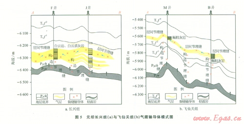 長興組與飛仙關(guān)組輸導(dǎo)模式(圖5)均屬于構(gòu)造節(jié)理縫溝通烴源巖與儲(chǔ)層并垂向輸導(dǎo),由層間節(jié)理縫和儲(chǔ)集體進(jìn)行側(cè)向輸導(dǎo)。而由前述分析知,長興組儲(chǔ)層巖性主要為白云巖、白云質(zhì)灰?guī)r,孔隙類型以晶間溶蝕孔、洞為主,裂縫發(fā)育,主要為Ⅱ、Ⅲ類儲(chǔ)層,儲(chǔ)層優(yōu)質(zhì)程度較高,而飛仙關(guān)組儲(chǔ)層巖性主要為鮞粒灰?guī)r、砂屑灰?guī)r,孔隙類型以粒間溶孑L、粒內(nèi)溶孔為主,僅局部發(fā)育裂縫,主要發(fā)育Ⅲ類儲(chǔ)層,總體上長興組白云巖加裂縫的輸導(dǎo)模式儲(chǔ)層連通性更好,輸導(dǎo)效率更高,更利于油氣高產(chǎn)富集。