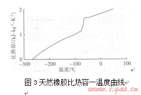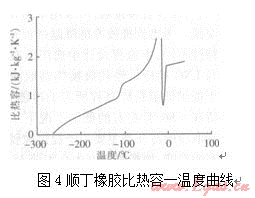 丁苯橡膠是丁二烯和苯乙烯的無(wú)規(guī)共聚物,其玻璃化溫度和比熱容隨丁二烯和苯乙烯配比的不同發(fā)生變化。以苯乙烯質(zhì)量分?jǐn)?shù)為25.5%的丁苯橡膠為例,其玻璃化溫度為一57℃,比熱容與溫度的關(guān)系為: