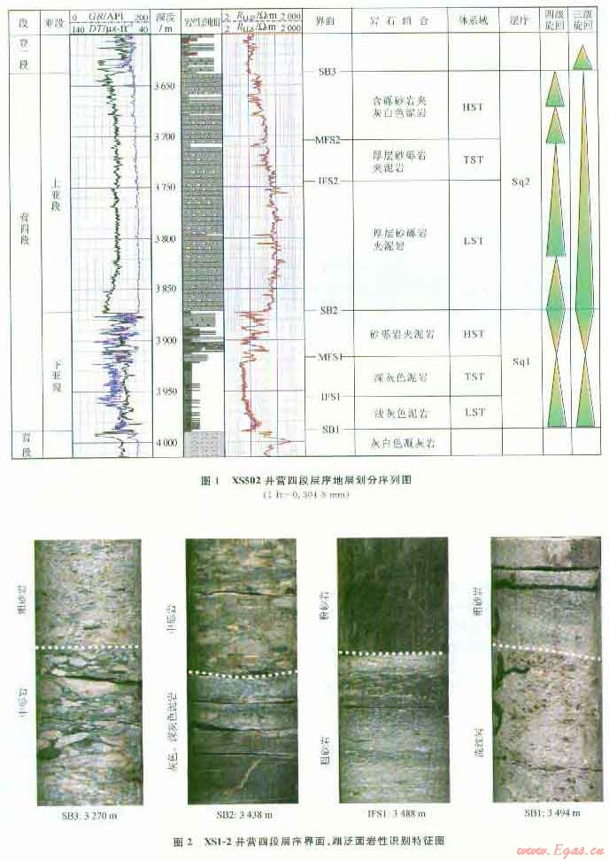 通過全井段取心井XSl—2井等多井巖心的細(xì)致觀察描述——識(shí)別巖性、巖相界面特征,多井對(duì)比和井震關(guān)系研究,根據(jù)地層發(fā)育特征、地層旋回性和巖相發(fā)育特征,對(duì)營(yíng)四段地層劃分出2個(gè)三級(jí)層序,即營(yíng)四段下層序(Sql)、營(yíng)四段上層序(Sq2)和6個(gè)四級(jí)層序(圖1、2)[2]。