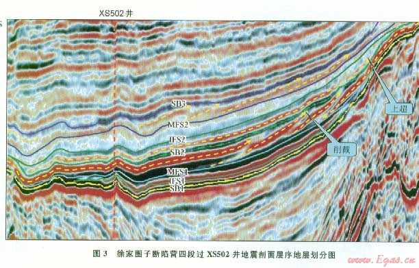 在地震剖面上,其為穩(wěn)定分布的T4反射界面,界面之下表現(xiàn)為削截,界面之上表現(xiàn)為上超(圖3)。