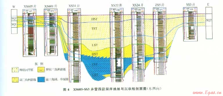 2)層序發(fā)育具明顯特征,營(yíng)四段下層序(Sq1)分布僅局限在斷陷中心部位,發(fā)育半深湖一扇三角洲前緣亞相,以暗色泥巖為主。營(yíng)四段上層序(Sq2)則是在斷陷變?yōu)橐粋€(gè)完整大湖盆的背景條件下形成的。