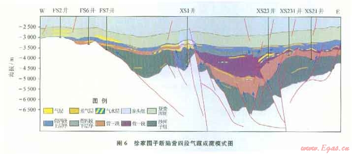 摘 要 松遼盆地徐家圍子斷陷下白堊統(tǒng)營(yíng)城組四段致密砂礫巖儲(chǔ)層是該區(qū)深層天然氣勘探的儲(chǔ)量接替層系之一,為預(yù)測(cè)其有利勘探區(qū)帶,應(yīng)用高精度層序地層學(xué)方法,研究了營(yíng)四段層序地層與致密氣藏形成的關(guān)系。①根據(jù)地層發(fā)育特征、地層旋回性和巖相發(fā)育特征,將營(yíng)四段劃分為2個(gè)三級(jí)層序,每一層序界面都有明顯的地震響應(yīng)、測(cè)井響應(yīng)和沉積學(xué)標(biāo)志特征。②建立了營(yíng)四段層序地層格架,營(yíng)四段下層序(Sql)分布僅局限在斷陷中心部位,發(fā)育半深湖一扇三角洲前緣亞相,以暗色泥巖為主,其為優(yōu)質(zhì)的烴源巖,可為上覆營(yíng)四段提供氣源;營(yíng)四段上層序(Sq2)的辮狀河三角洲前緣亞相物性好,是主要儲(chǔ)層發(fā)育的有利部位。③構(gòu)建了營(yíng)四段致密砂礫巖氣藏的2種成藏模式:一種是沙河子組為烴源巖,斷裂為運(yùn)移通道,砂礫巖與火山巖為儲(chǔ)層的下生上儲(chǔ)式成藏模式,有利勘探區(qū)位于興城、徐東和徐南地區(qū),預(yù)測(cè)天然氣資源潛力達(dá)450×108 m3;另一種是營(yíng)四段下層序暗色泥巖為烴源巖,上層序砂礫巖為儲(chǔ)層,自生自儲(chǔ)或下生上儲(chǔ)式成藏模式,有利區(qū)位于斷陷中心的XS22井區(qū),預(yù)測(cè)天然氣資源潛力約為l00×108 m3。