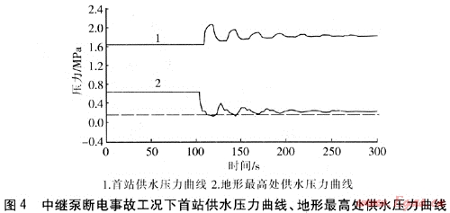 由圖4可知,首站循環(huán)泵出口壓力波動(dòng)較大,最高達(dá)到2.05MPa,這比采用靜態(tài)水力分析的結(jié)果高約0.5MPa。在中繼泵斷電事故工況下,出現(xiàn)了地形最高處供水壓力低于飽和蒸汽壓力的情況,此時(shí)供熱介質(zhì)將發(fā)生汽化,易發(fā)生水擊事故。