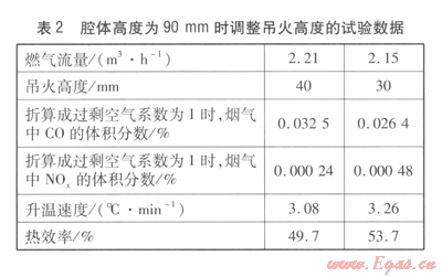 吊火高度過低則排煙不暢,影響一次空氣的引入而導(dǎo)致煙氣中的C0含量偏高;吊火高度過高,煙氣中的C0含量雖然低,但影響了熱效率。因此,在保證煙氣中C0含量達到相關(guān)標(biāo)準(zhǔn)的前提下,應(yīng)盡可能降低吊火高度。經(jīng)試驗得出,吊火高度取30~40 mm比較合適。