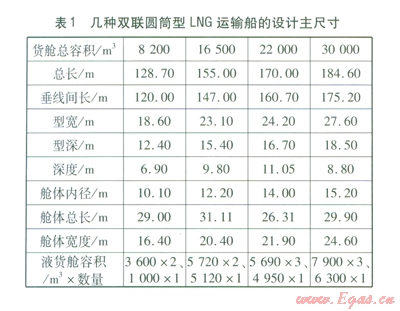 國內(nèi)外雙聯(lián)圓筒型LNG運(yùn)輸船的設(shè)計主尺寸[15-16]見表l,支線LNG船的液貨艙尺寸即為表l中容積22