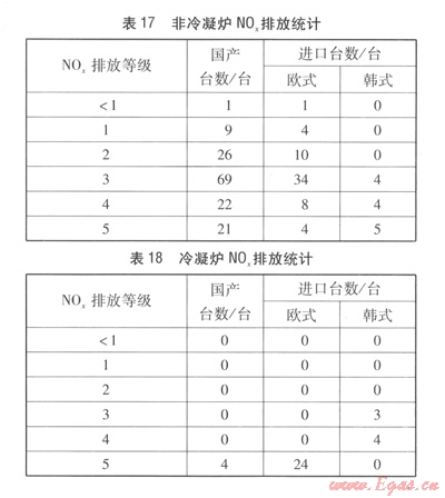 表16中,l級最差,5級最好。非冷凝爐N0x排放統(tǒng)計見表l7,冷凝爐N0x排放統(tǒng)計見表1 8。