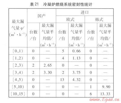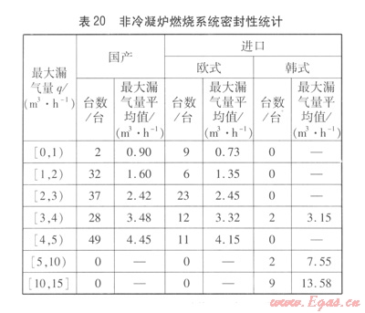 非冷凝爐燃燒系統(tǒng)密封性統(tǒng)計見表20,冷凝爐燃燒系統(tǒng)密封性統(tǒng)汁見表21。