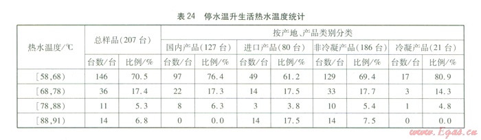 由表24,我們可以得出以下結(jié)論:全部樣品停水溫升溫度分布范圍為58~91℃,其中在58~78℃范圍分布比例較大。冷凝產(chǎn)品、非冷凝產(chǎn)品、國內(nèi)產(chǎn)品與進口產(chǎn)品分布趨勢與總樣品趨勢相同。