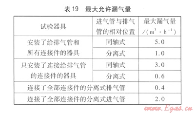 GB 25034-2010標準的第6.2.2條規(guī)定了燃燒系統(tǒng)密封性,在規(guī)定的試驗條件下,器具給、排氣系統(tǒng)泄漏量應小于表19的規(guī)定值。