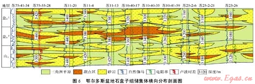 ②儲(chǔ)集體物性與連續(xù)性橫向變化。這是由于沉積環(huán)境、成巖作用與后生改造作用強(qiáng)度的橫向變化,使儲(chǔ)集體在總體連續(xù)且大型化發(fā)育的背景上,其內(nèi)部存在儲(chǔ)集空間與物性的橫向規(guī)模變化,因而在似層狀分布背景上,形成了由一系列孔、滲和孔喉結(jié)構(gòu)相對(duì)較好的儲(chǔ)滲單元或縫洞單元組成的儲(chǔ)集體群,單個(gè)儲(chǔ)滲單元和縫洞單元的規(guī)模不大,且尺度多變,但形成的儲(chǔ)集體群的規(guī)模相當(dāng)大。如鄂爾多斯盆地蘇里格氣田的砂巖儲(chǔ)集層,主要由眾多致密砂體和常規(guī)砂體組成(見(jiàn)圖6)。