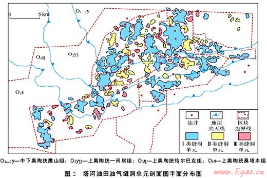 大型化成藏包含兩方面含義:①成藏要素的大型化發(fā)育與平面上的規(guī)模變化。從成藏要素看,烴源灶、儲(chǔ)集體以及生儲(chǔ)蓋組合的分布面積至少在數(shù)千甚至上萬(wàn)平方千米以上,如鄂爾多斯盆地上古生界石炭系煤系烴源巖與二疊系碎屑巖儲(chǔ)集層,分布面積都超過(guò)20×104km2。從成藏要素的規(guī)模變化看,烴源灶、儲(chǔ)集體的平面分布存在強(qiáng)烈的非均勻性,致使形成的地層和巖性圈閉在橫向上具有多變性,呈集群式分布。如塔里木盆地輪南—塔河奧陶系碳酸鹽巖縫洞型大油氣田,可以劃分出數(shù)百個(gè)縫洞單元,每個(gè)縫洞單元都是一個(gè)相對(duì)獨(dú)立的油氣聚集單元,形成的油氣藏呈集群式分布(見(jiàn)圖2)。②成藏分布樣式上表現(xiàn)為薄餅式或集群式成藏,這是中低豐度油氣藏群區(qū)別于常規(guī)高豐度油氣藏(田)和非常規(guī)連續(xù)型油氣聚集最典型的特征。