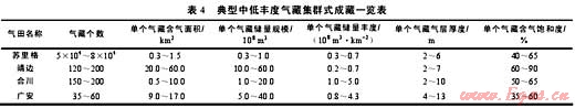 集群式成藏是指油氣在一系列呈集群式發(fā)育的地層、巖性圈閉中聚集而形成的一類成藏現(xiàn)象。這是由于在克拉通盆地平緩臺(tái)地區(qū)的碳酸鹽巖層系、陸內(nèi)坳陷海陸過(guò)渡相與陸相層系以及前陸盆地緩翼廣大斜坡區(qū)的陸相沉積層系中,因建設(shè)性成巖和后生成巖改造作用,或由于原始沉積物源區(qū)巖性多變、水動(dòng)力能量多變等,導(dǎo)致儲(chǔ)集層非均質(zhì)性強(qiáng),形成眾多呈獨(dú)立或半獨(dú)立狀分布的聚集體,就像玻璃板中眾多大小不一的氣泡,單體規(guī)模不大,但儲(chǔ)集體眾多則形成了規(guī)模巨大的集合體(見(jiàn)表4)。當(dāng)油氣充注后,不僅形成的油氣藏群規(guī)模很大,而且這些規(guī)模巨大的油氣藏群對(duì)封蓋條件的要求也不高,只要有遮擋條件(多數(shù)小于幾個(gè)兆帕)就可規(guī)模成藏,其中豐度較高的油氣藏(俗稱“甜點(diǎn)”)是油氣勘探的重點(diǎn)。如鄂爾多斯盆地蘇里格氣田盒8段心灘砂體,由于巖性、物性橫向變化劇烈,致使大氣田由成千上萬(wàn)個(gè)單體規(guī)模較小的氣藏群構(gòu)成,常規(guī)小型巖性氣藏之間連續(xù)或不連續(xù)分布著含氣飽和度較低的致密氣層、干層或水層(蘇里格西區(qū)低部位),總體表現(xiàn)為非常規(guī)氣與常規(guī)氣的混合共生。根據(jù)對(duì)蘇里格氣田的解剖,氣田的含氣面積接近3.3×104km2,依據(jù)砂體形態(tài)可以確定的氣藏?cái)?shù)量約5×104~8×104個(gè),單個(gè)氣藏氣柱高度2~6m、儲(chǔ)量規(guī)模一般在3000×104~10000×104m3,整個(gè)氣田的平均儲(chǔ)量豐度約0.7×108m3/km2。致密砂巖普遍含氣,含氣飽和度不高但連續(xù)分布。