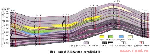 大范圍成藏組合是指“甜點(diǎn)”富集油氣,而成藏范圍很廣的一類成藏組合。這類組合主要形成于三明治式組合和倒灌式組合之中,以四川盆地川中地區(qū)須家河組和鄂爾多斯盆地中部奧陶系馬家溝組巖溶風(fēng)化殼代表。勘探揭示,單一有經(jīng)濟(jì)性的油氣聚集范圍有限,但平面上由數(shù)十乃至上百個(gè)油氣藏散布于廣闊的區(qū)域內(nèi),油氣藏之間多被水區(qū)、致密區(qū)構(gòu)成的“天窗”阻隔,具有斑塊狀成藏特征。研究表明,導(dǎo)致成藏分布不連續(xù)的原因有二:①烴源灶分布不均勻、供烴總量不充分,近源儲(chǔ)集體優(yōu)先成藏;②儲(chǔ)集體的連續(xù)性較差,導(dǎo)致形成的油氣藏在很大的范圍內(nèi)呈星羅棋布式分布。如四川盆地須家河組氣藏(見(jiàn)圖8),由于須一、三、五段煤系源巖的連續(xù)性平面變化較大,一些區(qū)域煤系烴源巖明顯減薄甚至缺失,致使與之接觸的須二、四、六段儲(chǔ)集層中含氣飽和度與資源豐度平面上有明顯變化,煤系烴源巖減薄區(qū)(俗稱“天窗區(qū)”)成藏機(jī)率低,而優(yōu)質(zhì)烴源巖和有效儲(chǔ)集層疊置區(qū)是天然氣的主要富集區(qū),形成的氣藏儲(chǔ)量豐度與含氣飽和度相對(duì)較高。