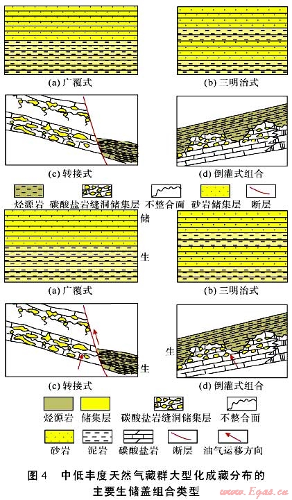 中國(guó)陸上大型含油氣盆地廣泛發(fā)育一類儲(chǔ)量豐度不高[25],但分布范圍很廣、儲(chǔ)量規(guī)模很大的油氣資源,筆者將其稱為中低豐度油氣資源??傮w而言,這類資源與高豐度油氣資源相比,不僅在油氣藏的外觀形態(tài)上有明顯差異,而且在制約油氣藏形成的生儲(chǔ)蓋組合特征、油氣生排運(yùn)聚機(jī)理、保存條件等方面都有其特殊性。因此筆者用“中低豐度油氣資源大型化成藏”的概念來(lái)表征這類資源的成藏和分布特征。