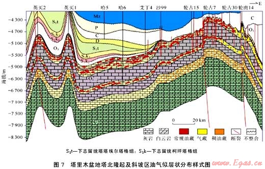 似層狀成藏是碳酸鹽巖巖溶縫洞型儲(chǔ)集層的主要成藏樣式??死ㄅ璧乩^承性古隆起圍斜部位受風(fēng)化巖溶以及順層、層間巖溶作用的綜合影響,廣泛發(fā)育似層狀分布的巖溶縫洞型儲(chǔ)集層,當(dāng)充注油氣后,就形成了似層狀油氣分布格局。以塔里木盆地塔北隆起斜坡區(qū)奧陶系一間房組、鷹山組和良里塔格組成藏為例,多種巖溶作用形成的縫洞體數(shù)量多達(dá)數(shù)百甚至上千個(gè),每個(gè)縫洞單元都是一個(gè)相對(duì)獨(dú)立的油氣聚集單元(見(jiàn)圖7)。多套似層狀分布的油氣藏群可以形成大油氣田,如塔河油田、哈拉哈塘油田等,地質(zhì)儲(chǔ)量規(guī)模在數(shù)億噸甚至數(shù)十億噸。