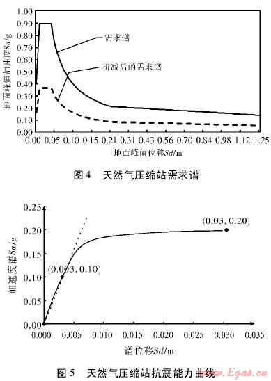 為了進(jìn)一步得到該站抗震能力曲線。以圖2所示能力曲線為基本形狀,并依據(jù)HAZUS-MH對(duì)相關(guān)能力曲線參數(shù)進(jìn)行設(shè)置。本例中屈服承載能力與極限承載能力兩個(gè)控制點(diǎn)相關(guān)參數(shù)設(shè)置如下:Cs為0.05,Te為0.35,α為0.75,γ為1.5,λ為2,μ為5。將以上參數(shù)代入能力譜控制點(diǎn)公式,得到該天然氣壓縮站抗震能力曲線如圖5所示。