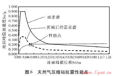將天然氣壓縮站抗震能力曲線與需求譜繪制在同一坐標(biāo)內(nèi),得到性能點(diǎn),如圖6所示??梢钥闯?,性能點(diǎn)對(duì)應(yīng)的地面峰值加速度約為0.2g,地面峰值加速度約為0.07m。該性能點(diǎn)反映了天然氣壓縮站在本次地震中所能承受的極限值。
