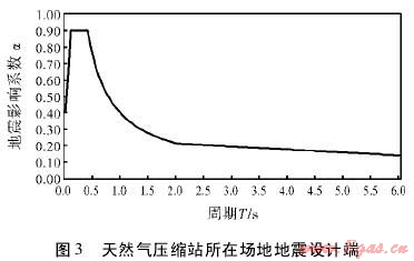根據(jù)規(guī)范要求,采用如圖1形式的設(shè)計(jì)反應(yīng)譜。反應(yīng)譜相關(guān)參數(shù)設(shè)置如下:水平地震影響系數(shù)最大值為0.9,特征周期值為0.4s,建筑結(jié)構(gòu)的阻尼比取0.05,地震影響系數(shù)曲線的阻尼調(diào)整系數(shù)為1.0,曲線下降段自特征周期至5倍特征周期區(qū)段的衰減指數(shù)取0.9。直線下降段自5倍特征周期至6s區(qū)段下降斜率調(diào)整系數(shù)取0.02。通過(guò)計(jì)算,得到天然氣壓縮站所在場(chǎng)地地震設(shè)計(jì)譜如圖3所示。以該反應(yīng)譜作為該天然氣壓縮站所在場(chǎng)地的地震潛在危險(xiǎn)。