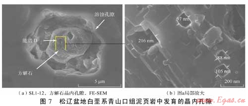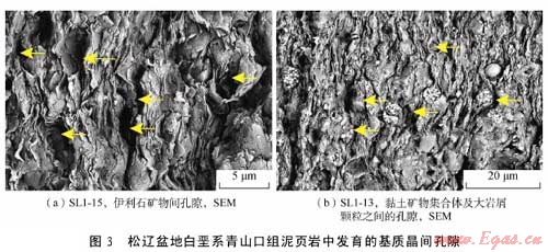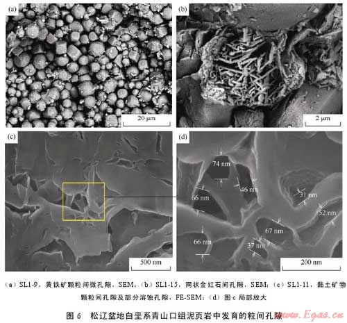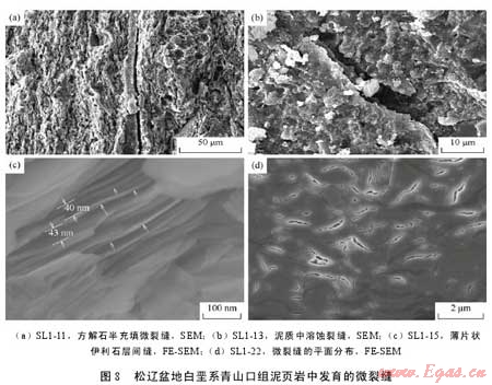 利用掃描電鏡和場(chǎng)發(fā)射掃描電鏡二次電子成像技術(shù)對(duì)松遼盆地主要生油層白堊系青山口組泥頁(yè)巖中發(fā)育的孔隙和微裂縫進(jìn)行了系統(tǒng)的成像觀察,發(fā)現(xiàn)該套頁(yè)巖中主要發(fā)育了5種類型孔隙即基質(zhì)晶間孔、有機(jī)質(zhì)孔、溶蝕孔、粒間孔、晶內(nèi)孔及微米—亞微米級(jí)(納米級(jí))微裂縫,微裂縫包括充填縫、溶蝕縫及層間縫。各種類型孔隙與微裂縫伴生發(fā)育,并可能彼此連通。這種復(fù)雜微裂縫網(wǎng)絡(luò)-孔隙系統(tǒng)的存在為油氣從烴源巖向外排驅(qū)提供了有效通道,同時(shí)也為滯留在泥頁(yè)巖中的部分油氣提供了有效的儲(chǔ)集空間。該套地層中各類型孔隙尺寸為納米—微米級(jí),可能主要受頁(yè)巖基質(zhì)的微觀孔隙結(jié)構(gòu)、礦物組成、有機(jī)質(zhì)類型以及有機(jī)質(zhì)的熱演化程度等因素的影響。