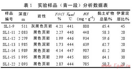 實(shí)驗(yàn)樣品取自松遼盆地北部齊家古龍凹陷、三肇凹陷白堊系青山口組一段泥頁(yè)巖(見圖1)。實(shí)驗(yàn)樣品有機(jī)質(zhì)豐度較高(見表1),有機(jī)碳含量平均2.89%;有機(jī)質(zhì)類型以Ⅰ、Ⅱ1型為主,氫指數(shù)一般在639~934mg/g;樣品主要處于中成巖作用階段,伊蒙混層比平均26.4%。全巖分析實(shí)驗(yàn)表明,樣品中黏土礦物含量較高,為50.7%~65.4%,平均60.3%,其次為石英(17.5%~25.0%)、斜長(zhǎng)石(7%~12%)、黃鐵礦(3%~6%)、方解石(1%~5%),此外還有少量的鉀長(zhǎng)石、白云石和菱鐵礦,不含赤鐵礦和方沸石(見圖2)。