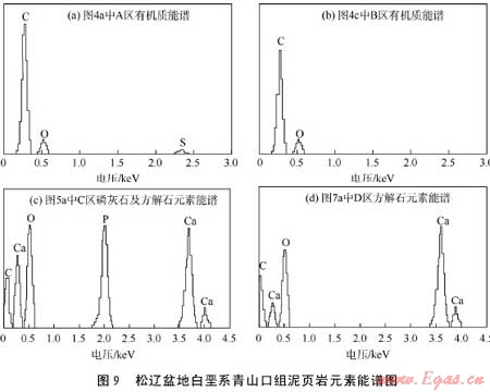 有機(jī)質(zhì)孔隙主要指有機(jī)質(zhì)團(tuán)塊內(nèi)部或有機(jī)質(zhì)生烴后內(nèi)部殘留的孔隙。圖4為場(chǎng)發(fā)射掃描電鏡二次電子成像后觀察到的泥頁(yè)巖樣品中的有機(jī)質(zhì)孔隙,圖4a為有機(jī)質(zhì)團(tuán)塊中的孔隙(圖4a中黃線標(biāo)出的黑灰色區(qū)域A區(qū)對(duì)應(yīng)的元素能譜見圖9a),孔徑為10~1500nmz已經(jīng)向烴類轉(zhuǎn)化,伴隨這一地質(zhì)過程,泥頁(yè)巖中產(chǎn)生大量有機(jī)質(zhì)生烴后的殘留孔隙,若泥頁(yè)巖處于高—過成熟階段,有機(jī)質(zhì)生烴后的殘留孔隙數(shù)量會(huì)大幅增加,其孔徑也會(huì)變大。