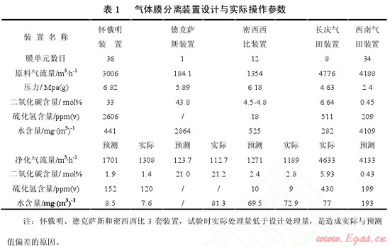 實際上從 20 世紀 80 年代以來,國內(nèi)外許多公司把膜分離技術應用于天然氣凈化領域,做了大量的試驗工作。表 1 是國內(nèi)外 5 套氣體膜分離裝置的設計與實際操作參數(shù),其中:懷俄明、德克薩斯和密西西比等 3 套裝置,采用美國格雷斯(GRECE)膜系統(tǒng)公司直徑為203.2mm的膜分離器[1];長慶氣田裝置,采用中科院大連化學物理研究所直徑為 200mm 的膜分離器,在原料氣處理量 12×104m3/d、壓力 5.4Mpa、溫度6~33℃條件下,經(jīng)膜系統(tǒng)凈化處理后,凈化氣壓力在 4.6Mpa時的水露點達到-13℃,甲烷回收率≥98%[2] ;西南油氣田裝置,由大連歐科膜技術工程有限公司負責成套,采用德國原裝進口直徑為 150mm 的膜分離器[3],設計原料氣處理量10×104m3/d、壓力2.4Mpa、溫度 50℃條件下,天然氣脫水率>85% 、甲烷損失率 <1% 、水露點:冬季<0℃ 、夏季<10℃ 。