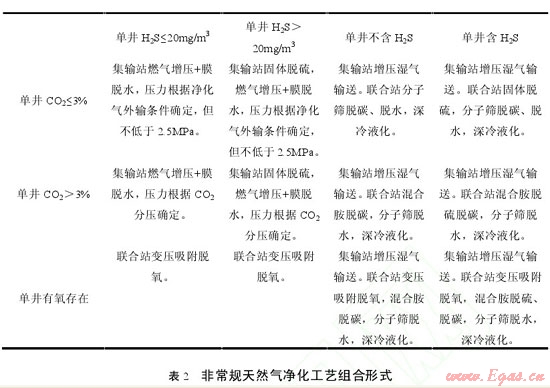 針對非常規(guī)天然氣單井氣質條件不同,可以選擇不同的處理工藝。主要分為凈化氣管道外輸和凈化氣液化運輸兩種類型,根據(jù)氣質條件的不同,選擇不同的脫硫、脫水具體工藝如表 2 所示。