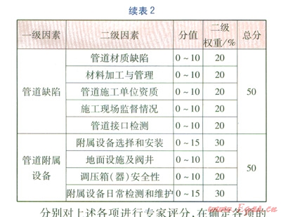 燃?xì)夤艿赖娘L(fēng)險(xiǎn)評價(jià)方法通常以W.Kent Muhlbaue提出的風(fēng)險(xiǎn)評價(jià)模型(評分法)為依據(jù),在W.Kent Muhlbaue所著的《管道風(fēng)險(xiǎn)管理手冊》中確定的4類評分指標(biāo)分別是第三方指數(shù)、腐蝕指數(shù)、設(shè)計(jì)指數(shù)、誤操作指數(shù)[3],對長輸油氣管道有很強(qiáng)的針對性,不一定完全適用于城市埋地燃?xì)夤艿?。在本文評分指標(biāo)體系的構(gòu)建中,將把文獻(xiàn)[3]評分法中不相關(guān)、不適應(yīng)的指標(biāo)予以剔除,根據(jù)城鎮(zhèn)燃?xì)夤艿赖奶攸c(diǎn)對指標(biāo)重新分類,并進(jìn)行適當(dāng)調(diào)整和補(bǔ)充,確定4大評分指數(shù),分別為腐蝕指數(shù)、外界干擾指數(shù)、管道缺陷指數(shù)、管道附屬設(shè)備失效指數(shù)。城市燃?xì)夤艿里L(fēng)險(xiǎn)評價(jià)評分表見表2。